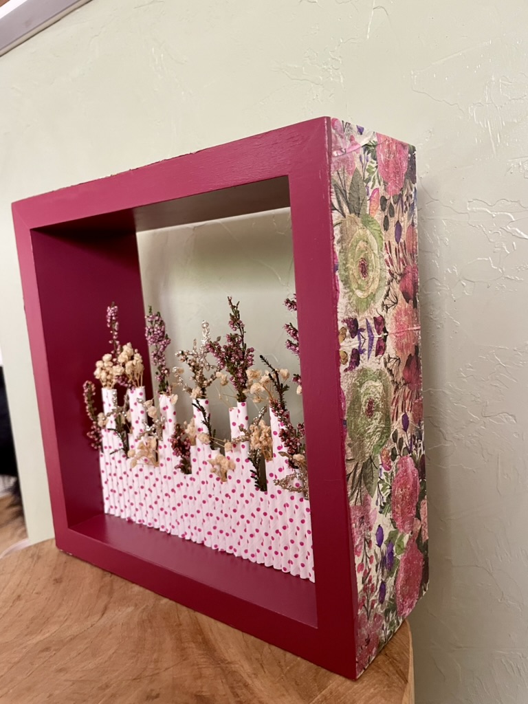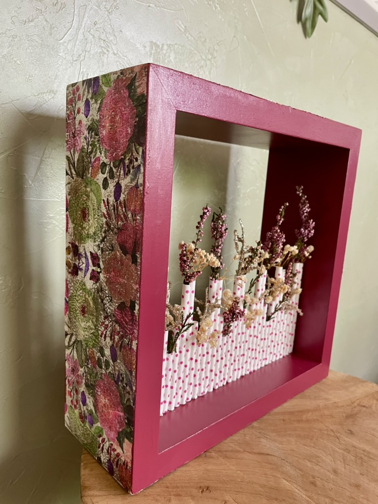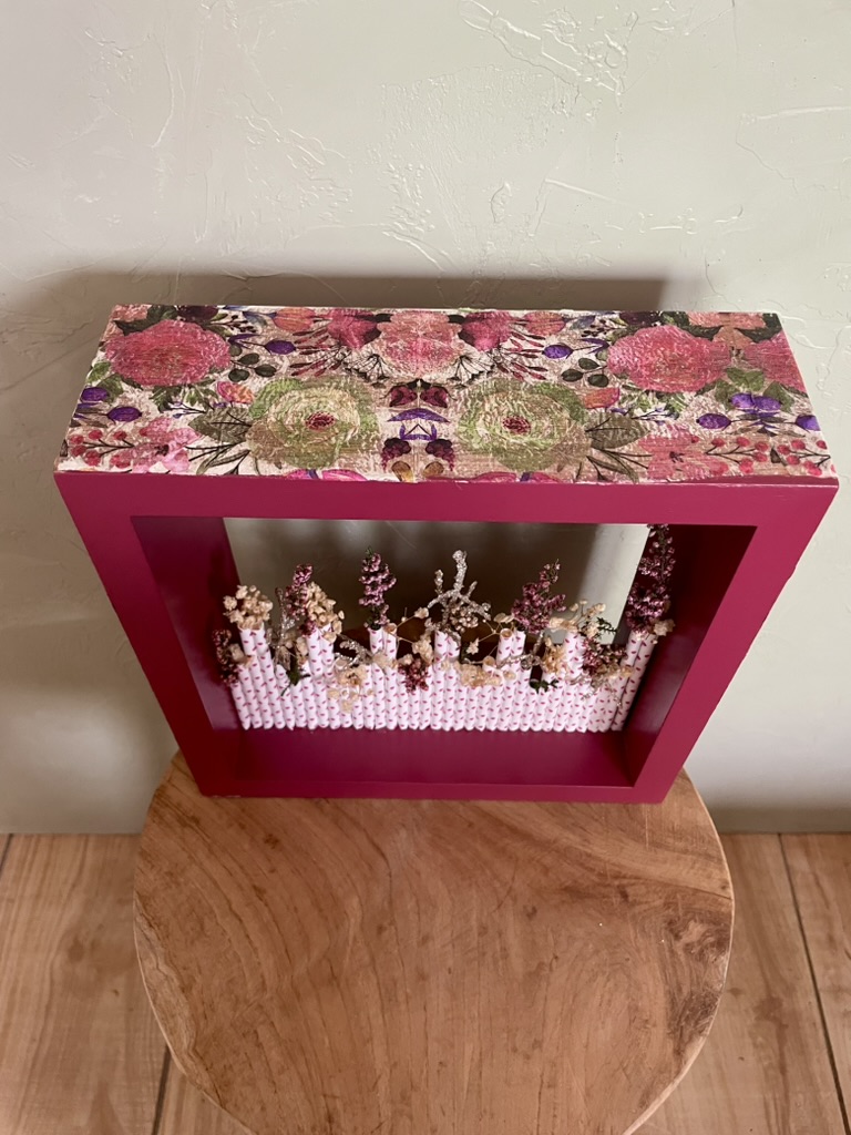 Du rose et des fleurs, quoi de plus romantique? Ce joli cadre peut s'accrocher au mur mais sa profondeur lui permet également de faire office de décoration à poser, ainsi vous pourrez le mettre où bon vous semble.