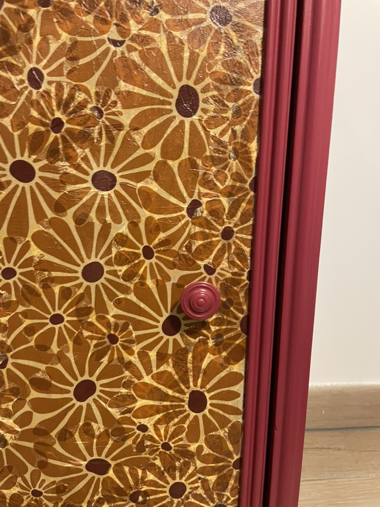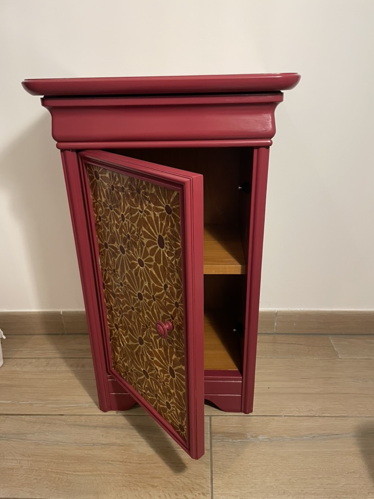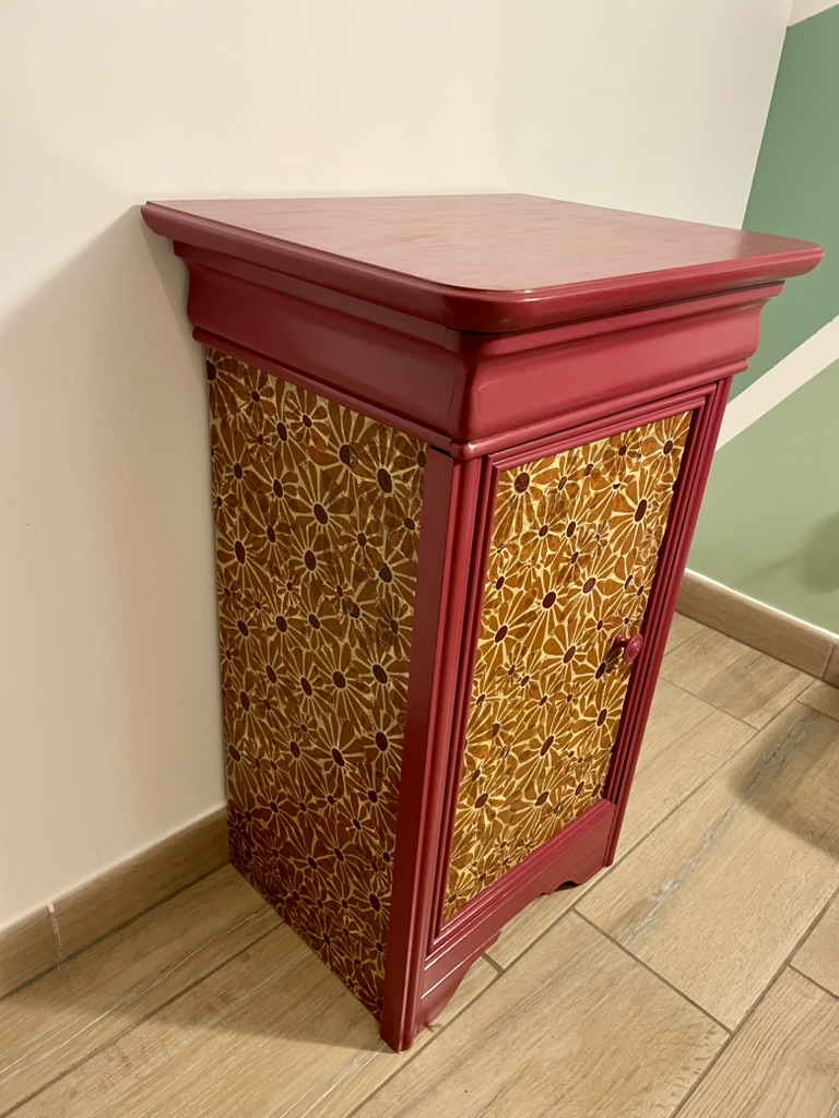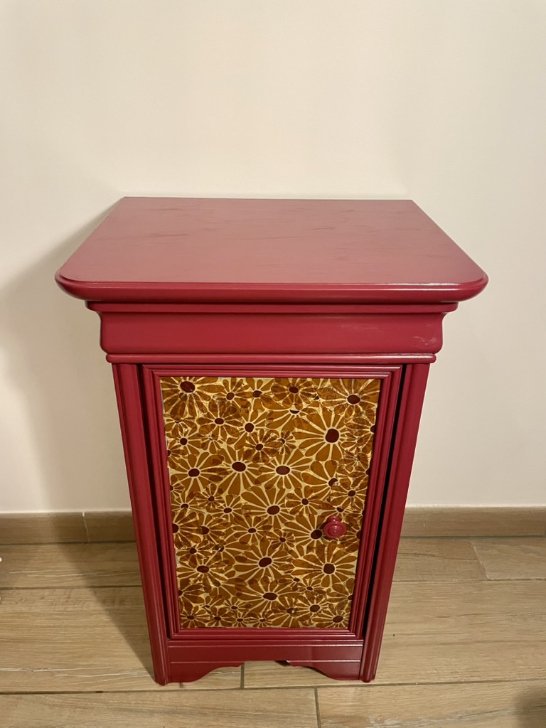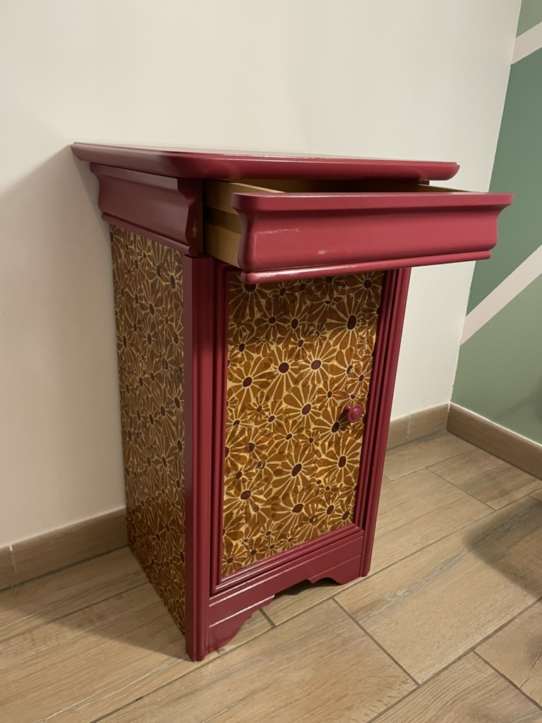 Cette ancienne console de téléphone adopte un nouveau look fleuri et haut en couleurs. Très pratique il possède un petit tiroir de rangement ainsi qu'un placard avec une étagère, il est prêt à vivre une nouvelle vie en tant que table de chevet ou meuble d'appoint.