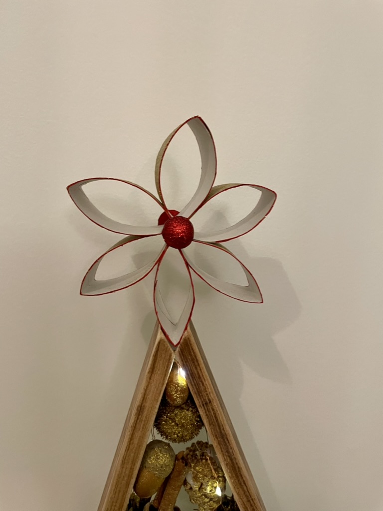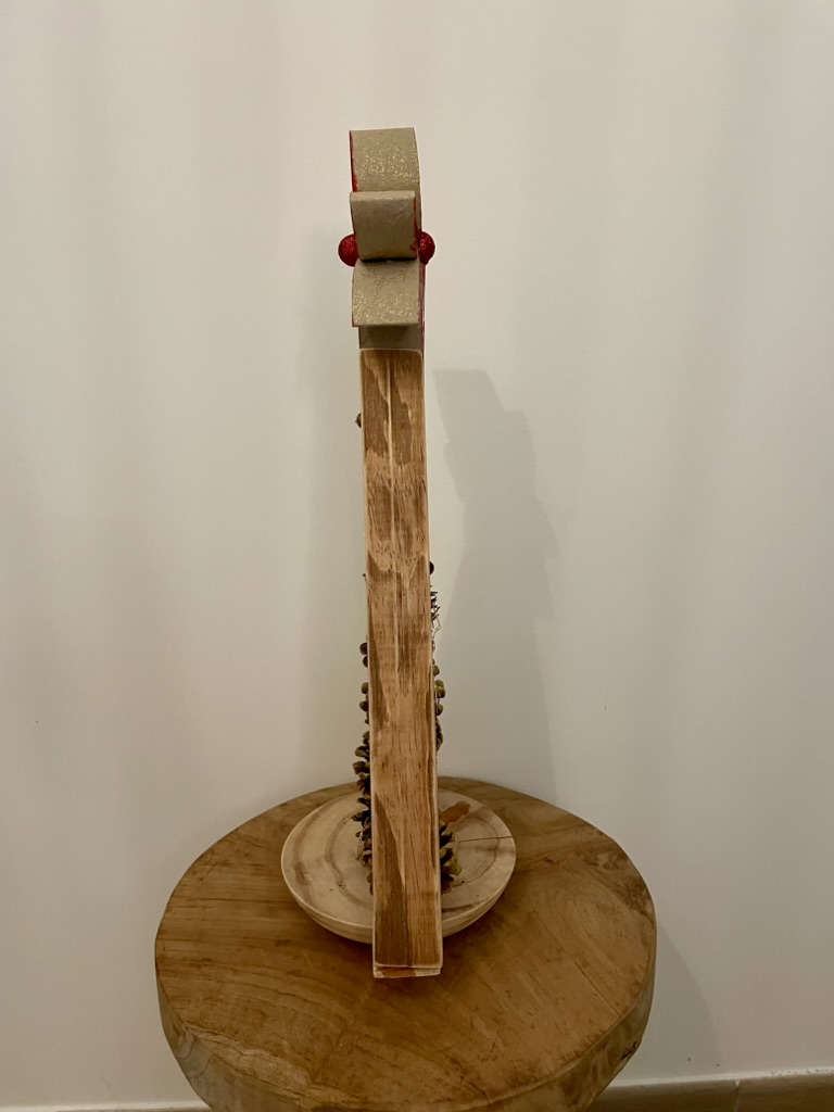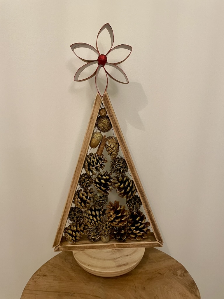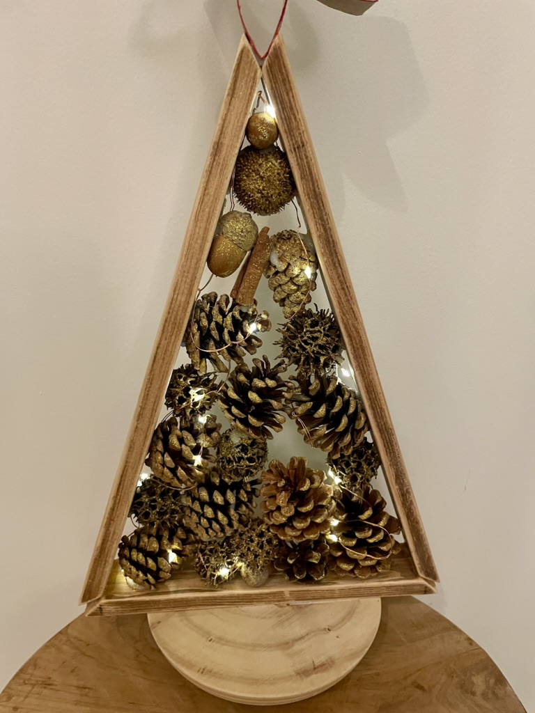 Envie d'une petite touche de déco naturelle? Ce petit sapin est fait pour vous! Réalisé avec des chutes de bois, il est orné de pommes de pin et de glands ramassés dans les bois. Une guirlande lumineuse et un vernis agrémenté de paillettes dorées viennent lui apporter un air festif.