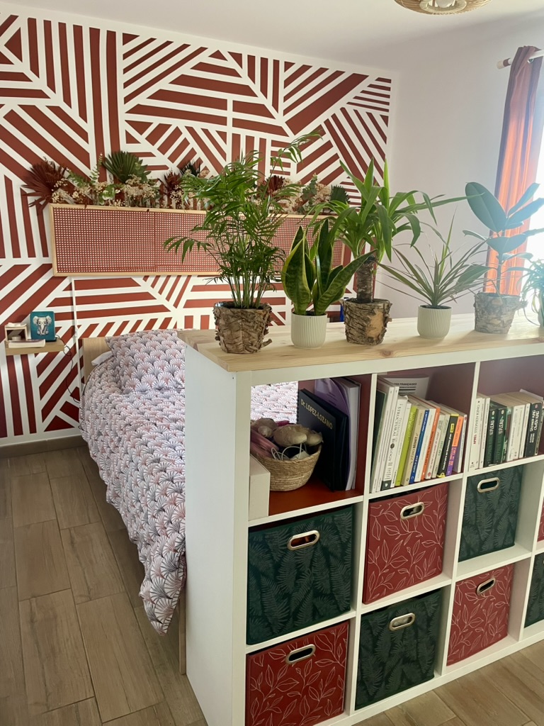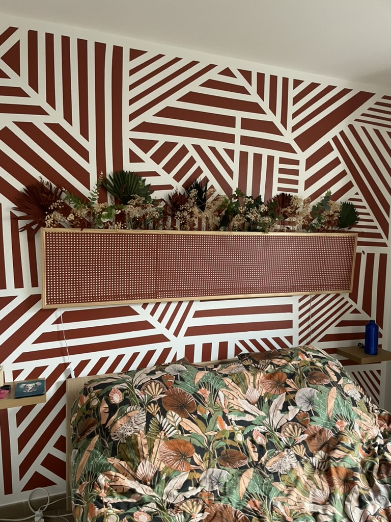 Cette tête de lit a été réalisée sur mesure, pour un décor naturel et floral. La couleur terracotta énergise l'ensemble en venant réveiller la douceur du bois clair.